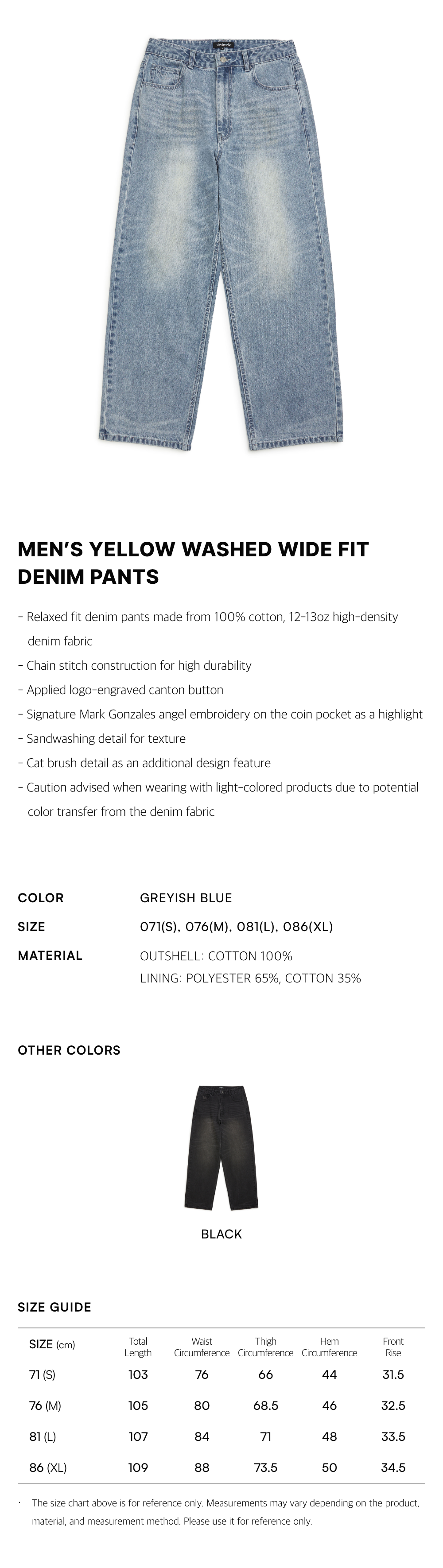 - Relaxed fit denim pants made from 100% cotton, 12-13oz high-density denim fabric