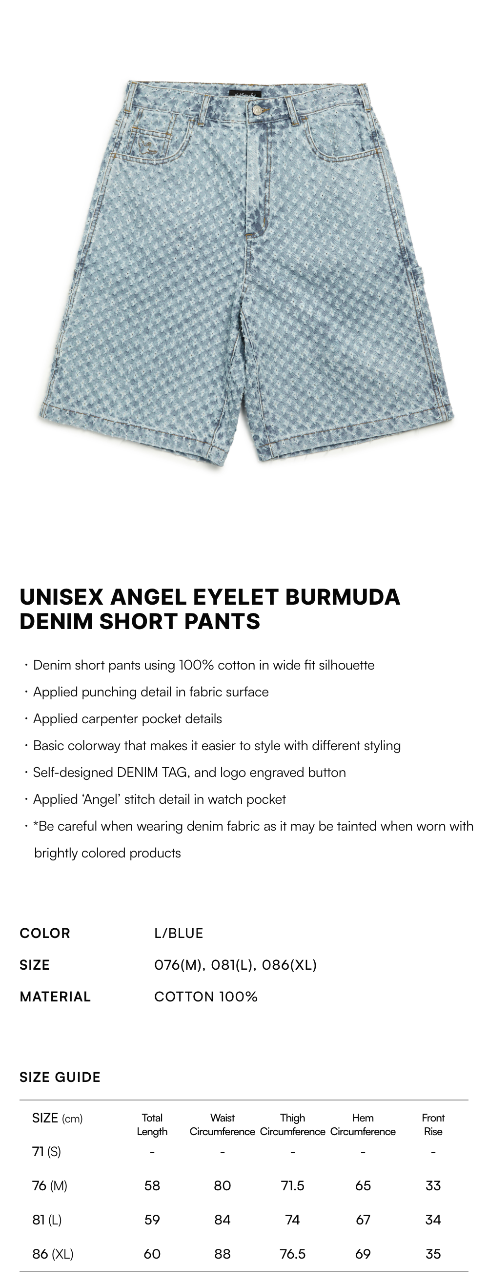【15% OFF】Unisex Angel Eyelet Burmuda Denim Short Pants - L/BLUE