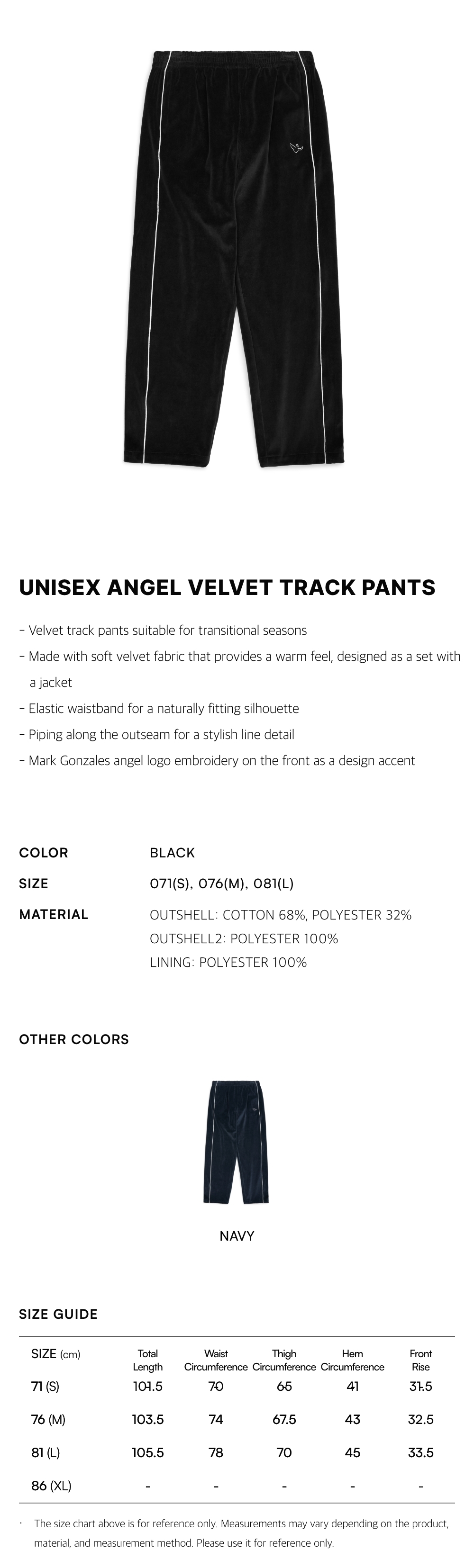 - Velvet track pants suitable for transitional seasons