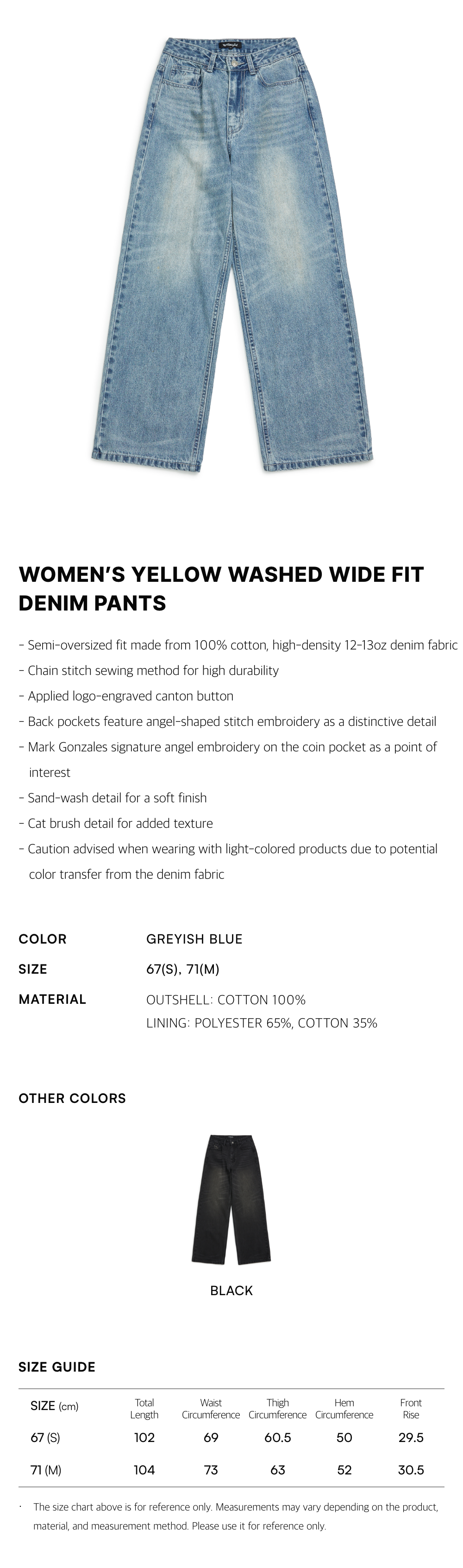 - Caution advised when wearing with light-colored products due to potential color transfer from the denim fabric