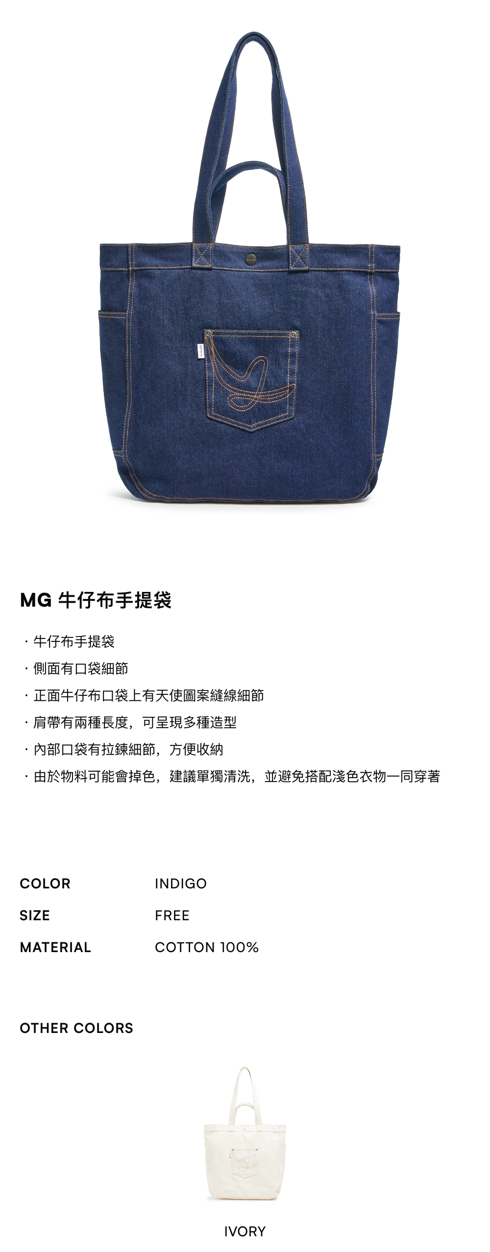 - 正面牛仔布口袋上有天使圖案縫線細節