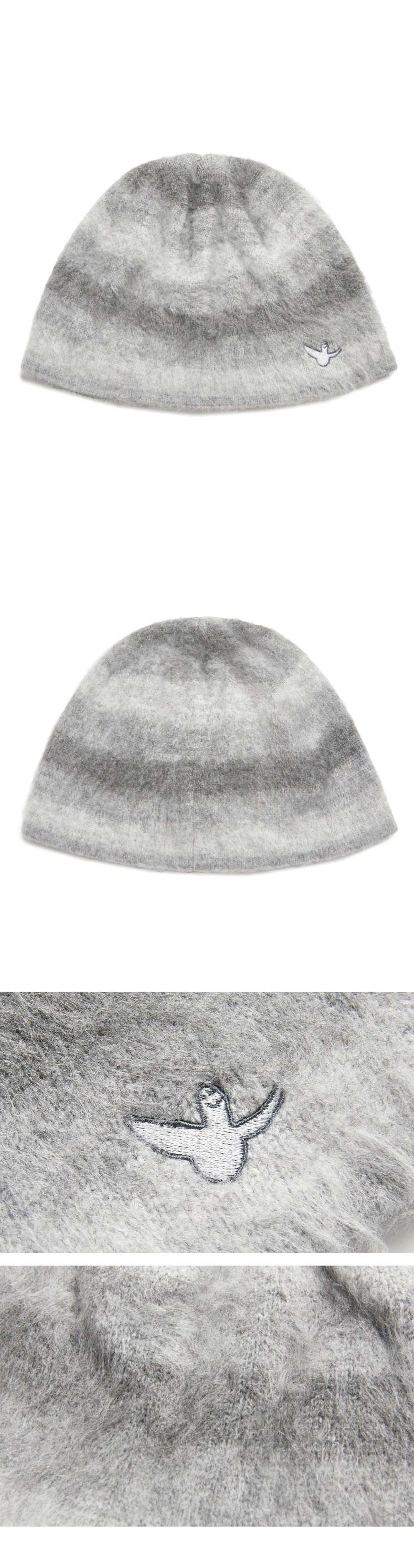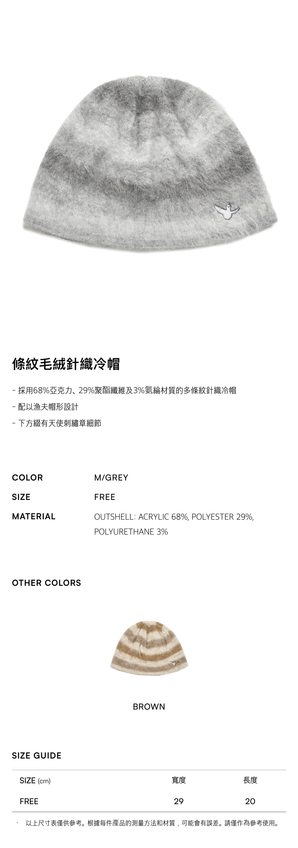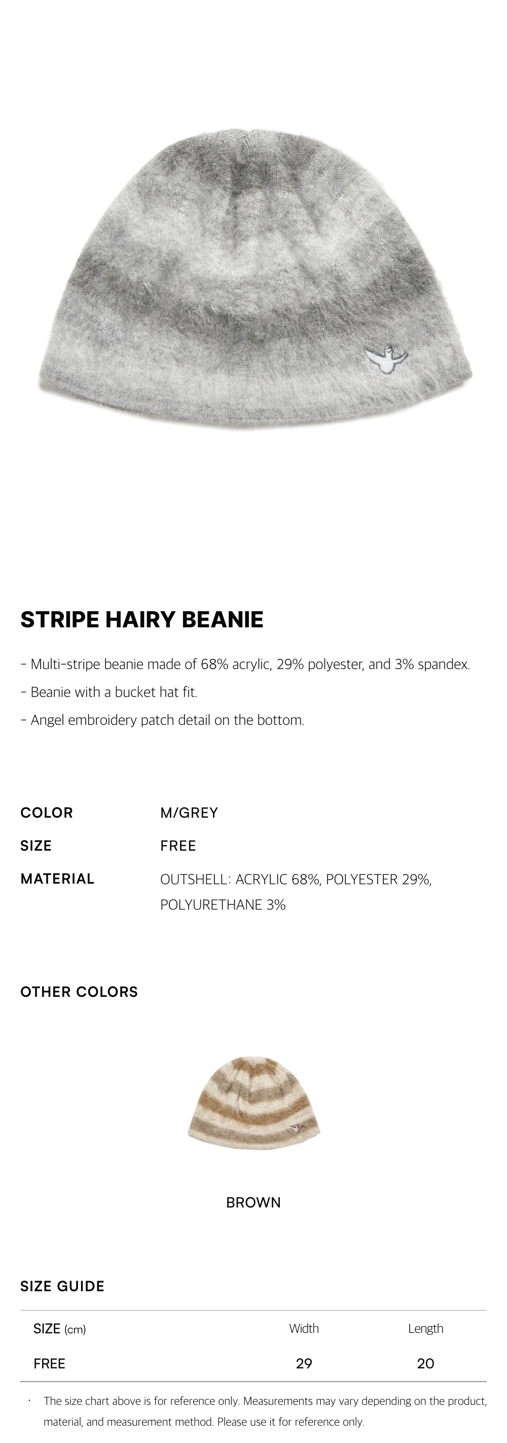 - Multi-stripe beanie made of 68% acrylic, 29% polyester, and 3% spandex.