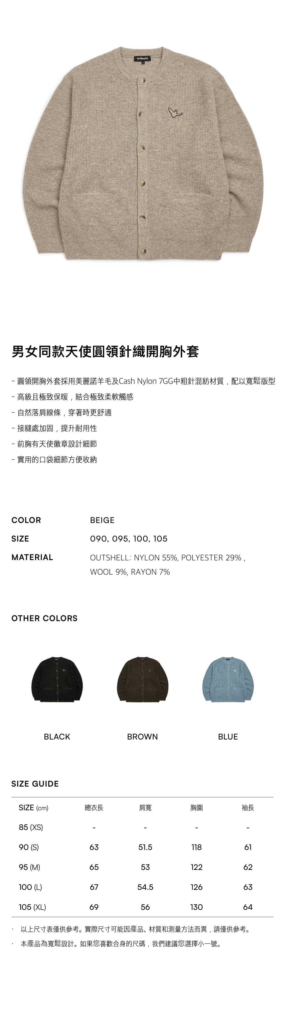 - 圓領開胸外套採用美麗諾羊毛及Cash Nylon 7GG中粗針混紡材質,配以寬鬆版型