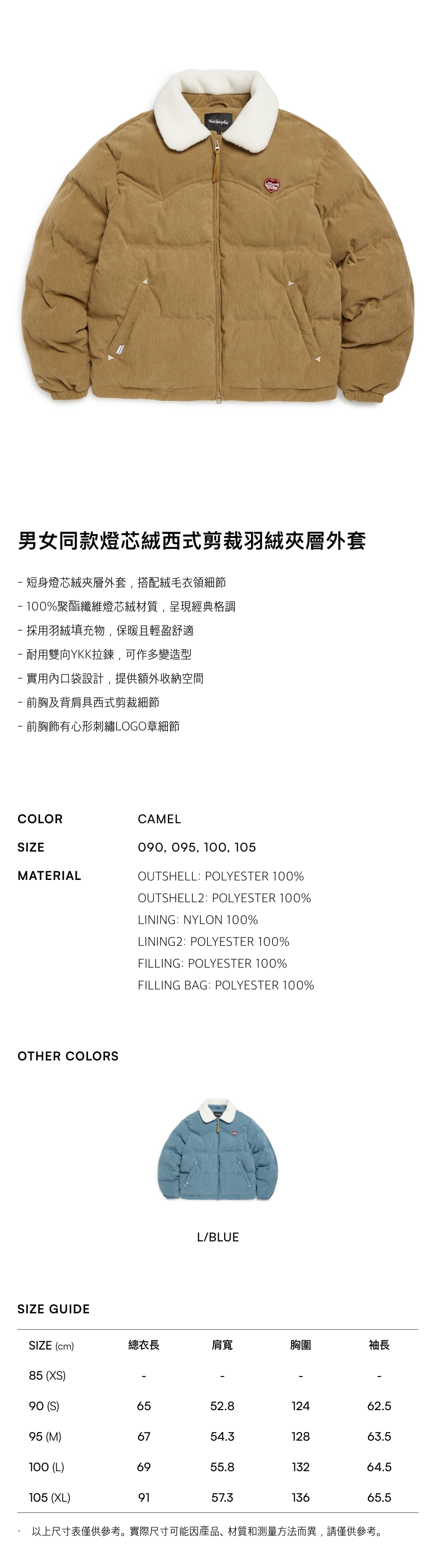 - 採用羽絨填充物,保暖且輕盈舒適