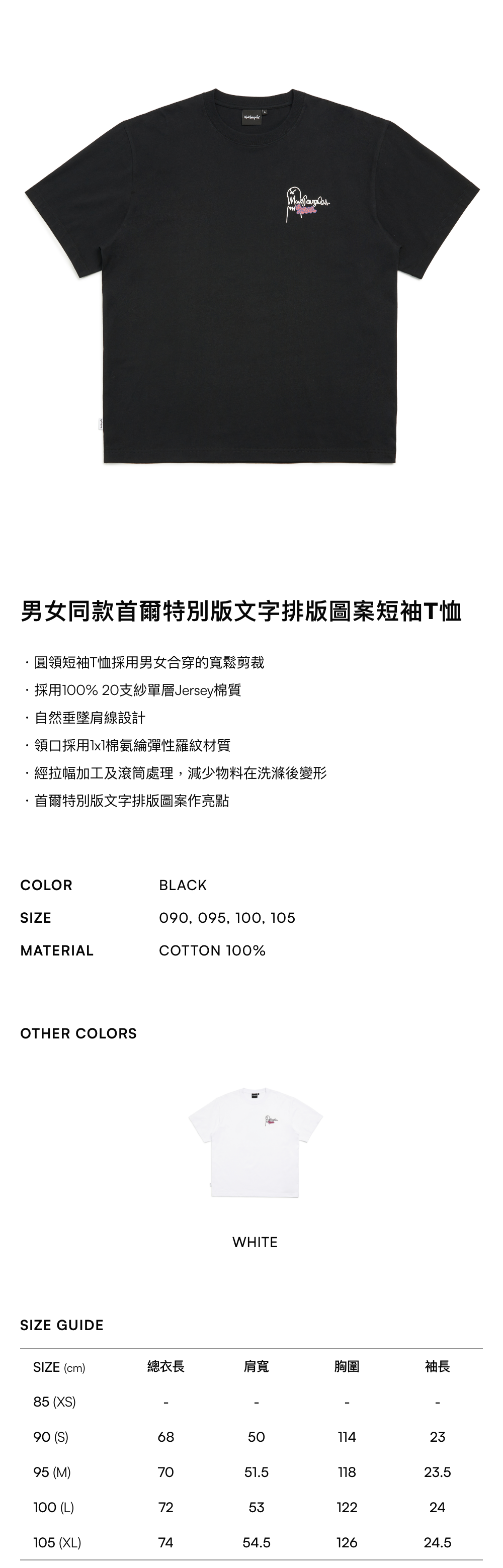 - 圓領短袖T恤採用男女合穿的寬鬆剪裁