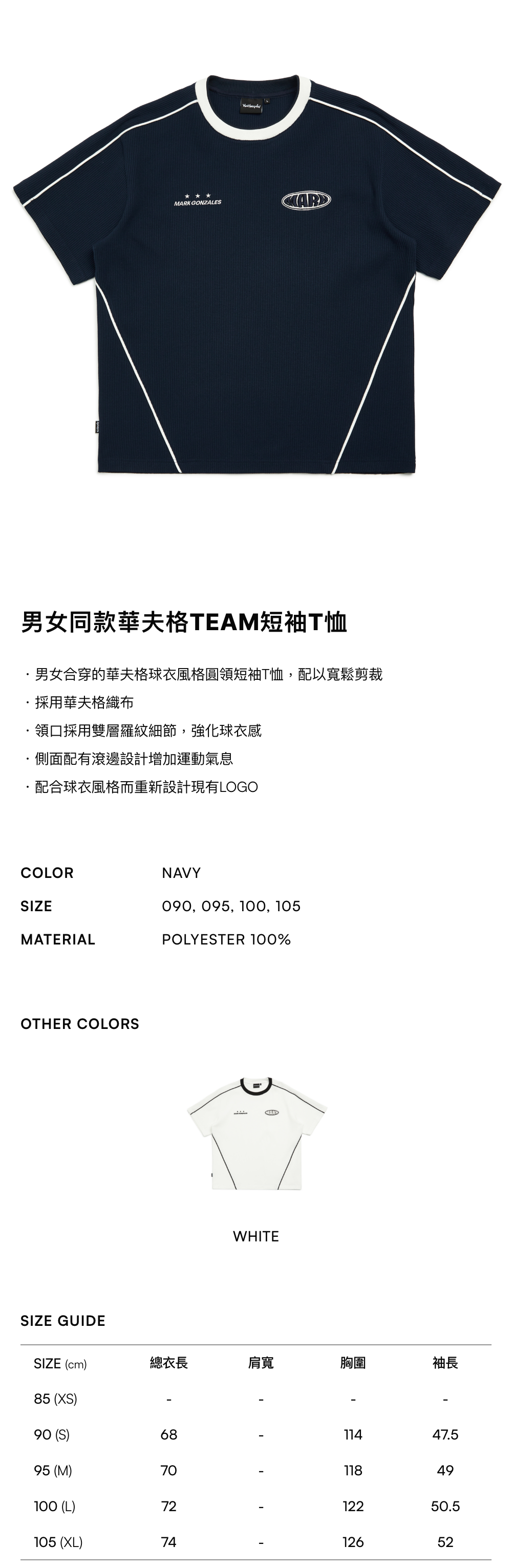 - 男女合穿的華夫格球衣風格圓領短袖T恤,配以寬鬆剪裁