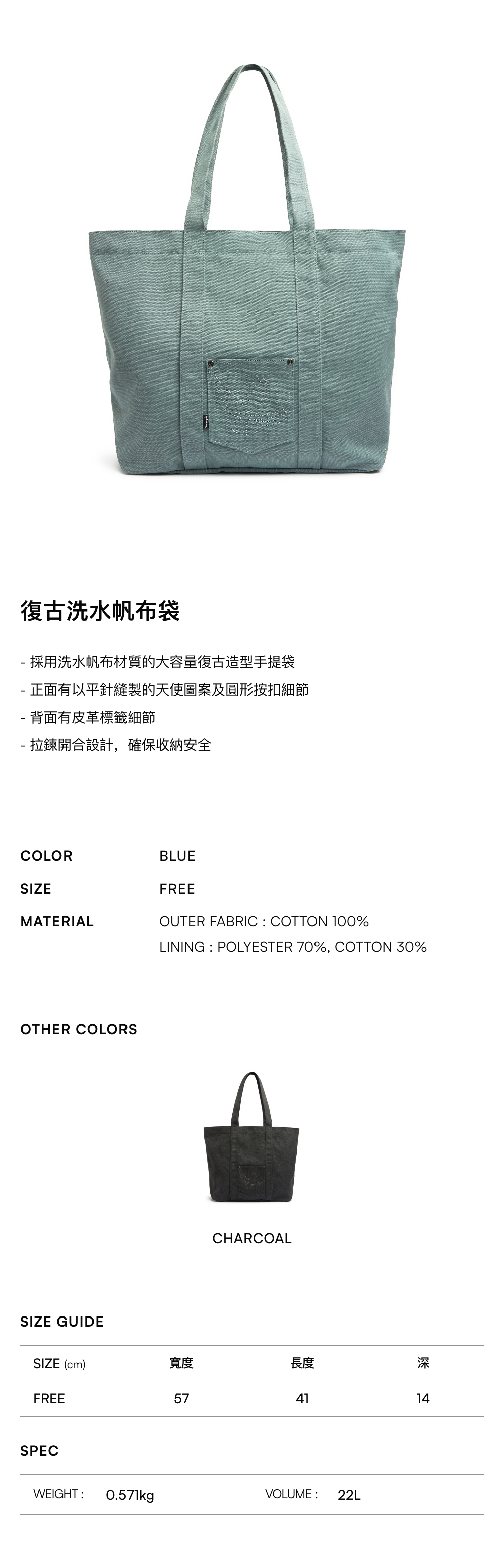 - 採用洗水帆布材質的大容量復古造型手提袋