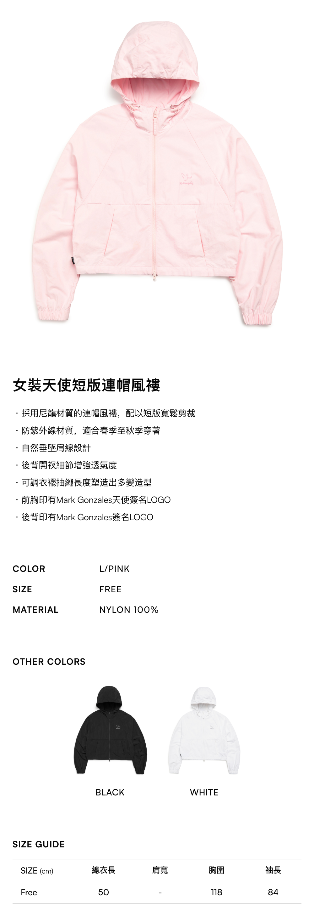 - 採用尼龍材質的連帽風褸,配以短版寬鬆剪裁