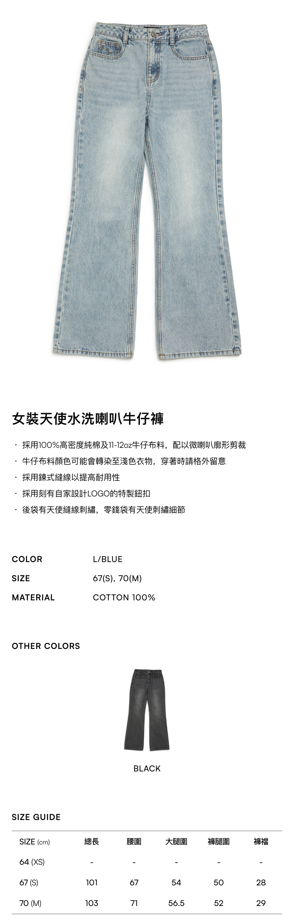 - 採用100%高密度純棉及11-12oz牛仔布料,配以微喇叭廓形剪裁
