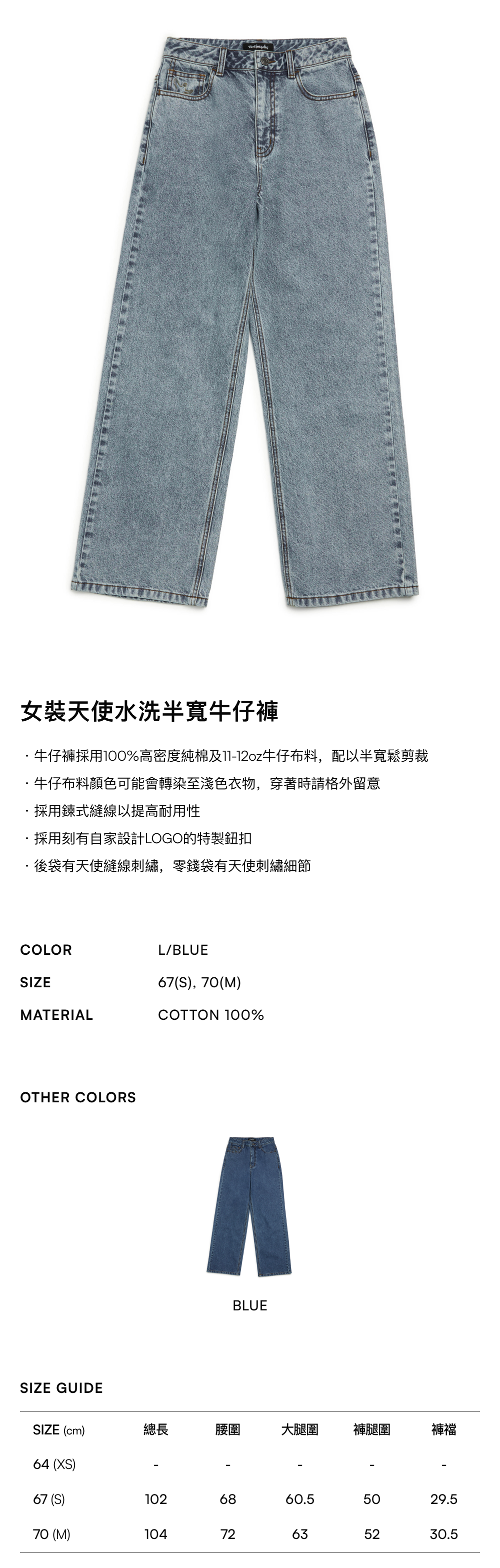 - 牛仔褲採用100%高密度純棉及11-12oz牛仔布料,配以半寬鬆剪裁