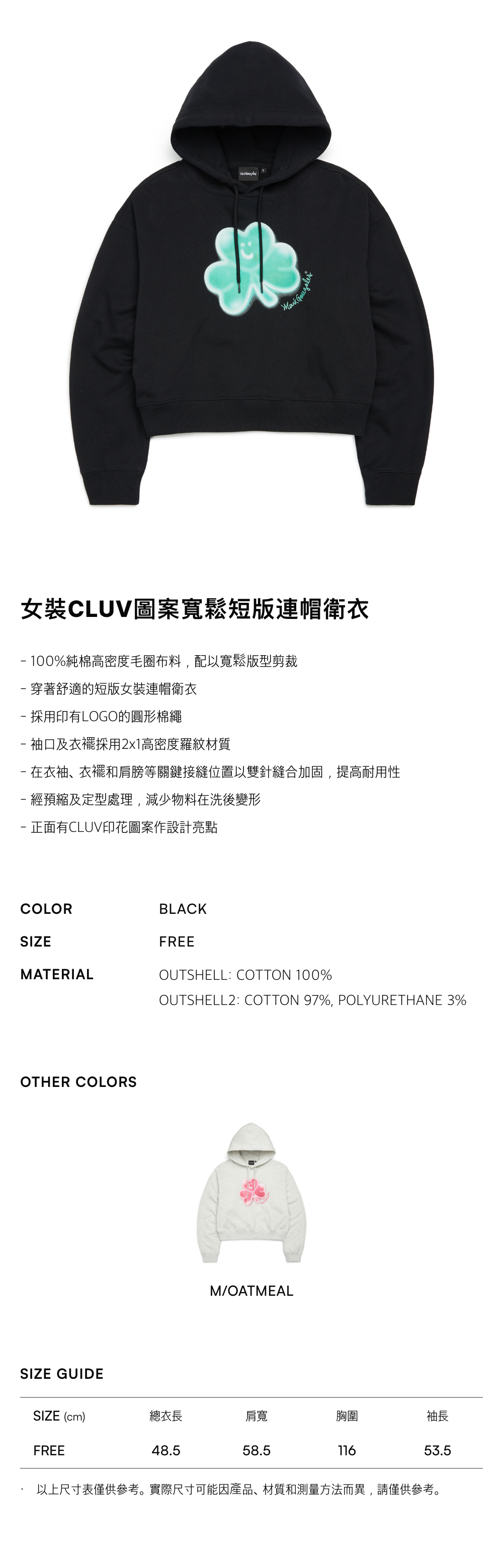 - 100%純棉高密度毛圈布料,配以寬鬆版型剪裁