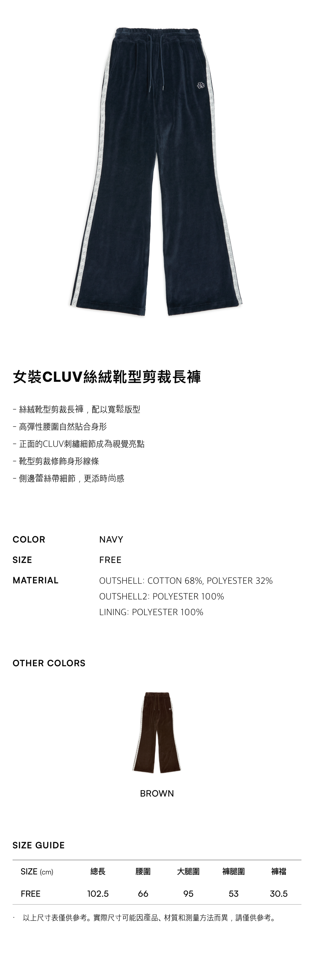 - 絲絨靴型剪裁長褲,配以寬鬆版型