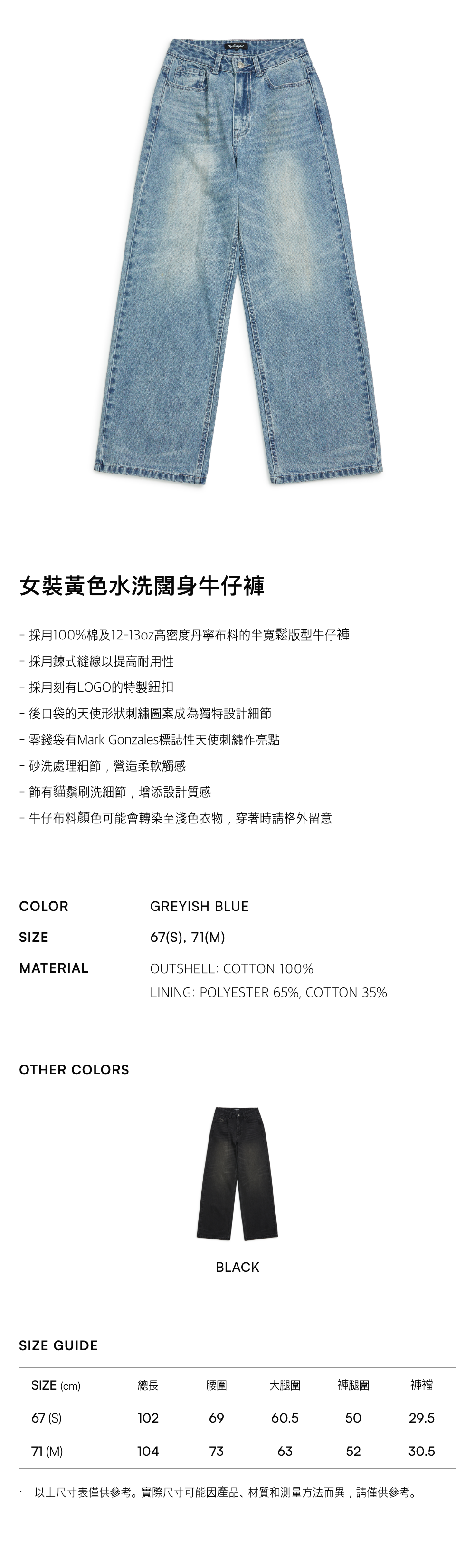 - 牛仔布料顏色可能會轉染至淺色衣物,穿著時請格外留意